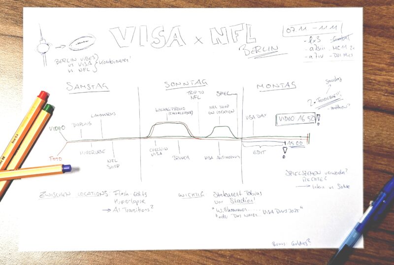 Den ganzen Samstag sammelten wir Footage aus Berlin: vom Potsdamer Platz über den Alex bis hin zum Checkpoint Charlie (der es für exakt 17 Frames ins Video geschafft hat). Diese Aufnahmen dienten uns als Story-Lückenfüller, um die einzelnen VISA-Elemente zu verbinden.